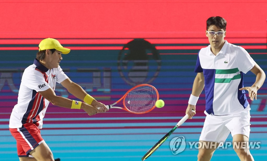 ▲ 경기 펼치는 권순우-정현 (서울=연합뉴스) 신준희 기자 = 30일 오후 올림픽공원 테니스경기장에서 열린 남자프로테니스(ATP) 투어 유진투자증권 코리아오픈 복식 8강전에서 정현(오른쪽)과 권순우가 안드레 예란손(스웨덴)-벤 매클라클런(일본) 조와 경기를 펼치고 있다. 2022.9.30 hama@yna.co.kr