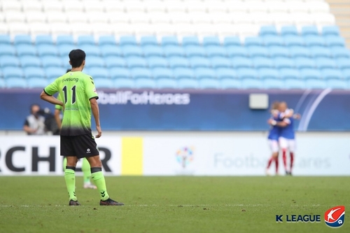 | ▲ 요코하마 마리노스 선수들의 기뻐하는 모습을 지켜보는 전북 조규성 [한국프로축구연맹 제공. 재판매 및 DB 금지] |