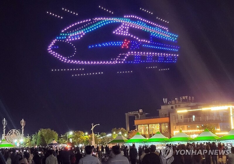 | ▲ 속초 밤하늘 밝힌 700대 드론쇼 (속초=연합뉴스) 이상학 기자 = 6일 오후 강원 속초시 엑스포 잔디광장에서 시승격 60주년을 기념을 겸한 설악문화제 개막행사가 열려 700대의 드론이 춘천~속초간 고속철도를 기념하는 쇼를 펼치고 있다. 2023.10.6 hak@yna.co.kr |