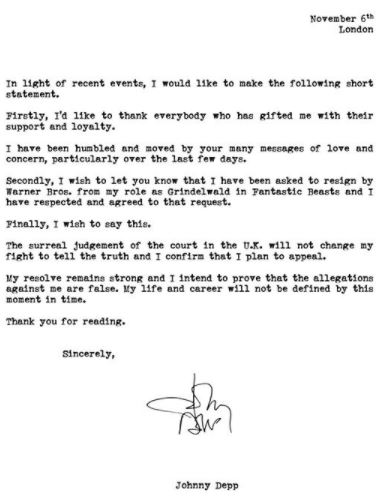 | ▲ 조니 뎁이 6일(현지시간) 자신의 인스타그램 계정에 올린 글. |