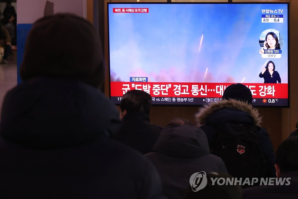 | ▲ People watch a report at Seoul Station in Seoul on Dec. 5, 2022, on North Korea's artillery firings. (Yonhap) |