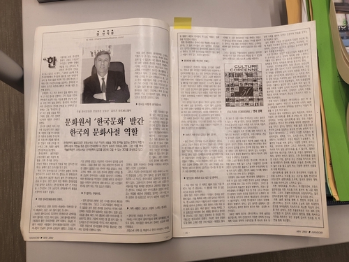 | ▲ 2002년 프랑스 한인 잡지와 인터뷰한 아르세니제빅 위원 (파리=연합뉴스) 현혜란 특파원 = 주프랑스 한국문화원에서 37년간 근무하다가 은퇴하는 조르주 아르세니제빅 전문위원이 사무실에 보관하고 있는 지난 2002년 프랑스 한인 잡지와의 인터뷰 기사. 2023.2.28 runran@yna.co.kr |