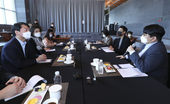 Bang Si-hyuk (R), founder and chairman of Hybe, the management agency of K-pop group BTS, speaks during a meeting with officials from President-elect Yoon Suk-yeol's transition team, including chairman Ahn Cheol-soo (L), in the company's office in Seoul on April 2, 2022. (Pool photo) (Yonhap)