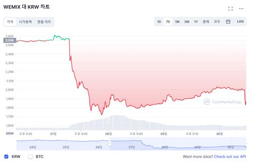 지난 27일 오후 4시께까지 2천550원선에서 거래되던 위믹스의 가격은 거래유의 종목 지정 직후 폭락, 다음날 한때 33% 떨어진 1천710원대까지 내려갔다. 현재는 1천800원선에서 거래되고 있다.