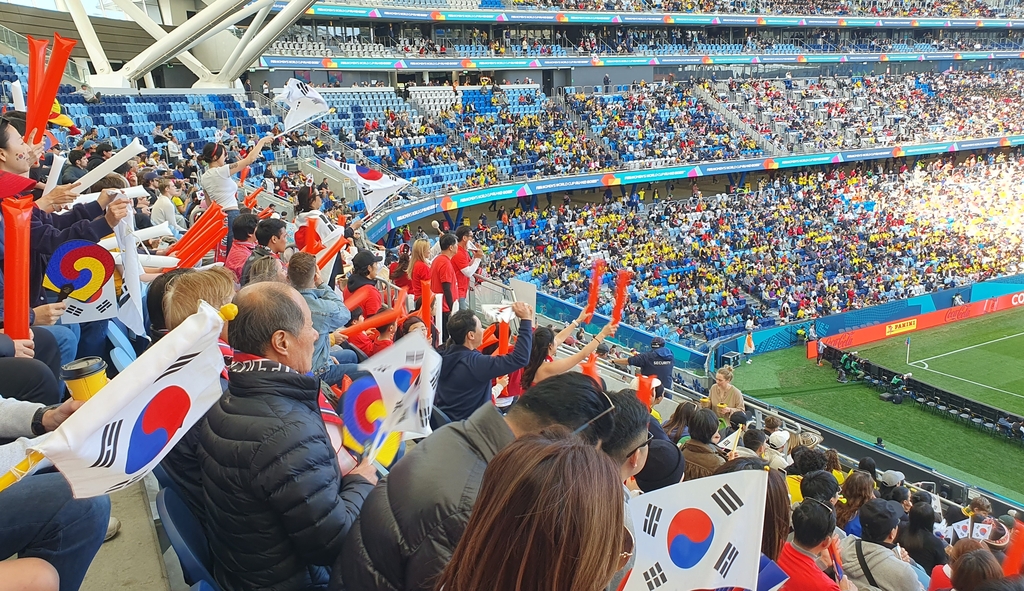| ▲ 2023 FIFA 호주·뉴질랜드 여자월드컵 한국·콜롬비아 경기 (시드니=연합뉴스) 정동철 통신원 = 2023 FIFA 호주·뉴질랜드 여자월드컵 한국·콜롬비아 경기에서 한국 관중들이 열렬하게 응원하고 있다. 2023.7.25. dcj@yna.co.kr |