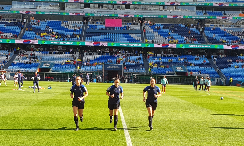 | ▲ 2023 FIFA 호주·뉴질랜드 여자월드컵 한국·콜롬비아 경기 심판들 (시드니=연합뉴스) 정동철 통신원 = 2023 FIFA 호주·뉴질랜드 여자월드컵 한국·콜롬비아 경기를 앞두고 심판들이 몸풀기 운동을 하고 있다. 2023.7.25. dcj@yna.co.kr |