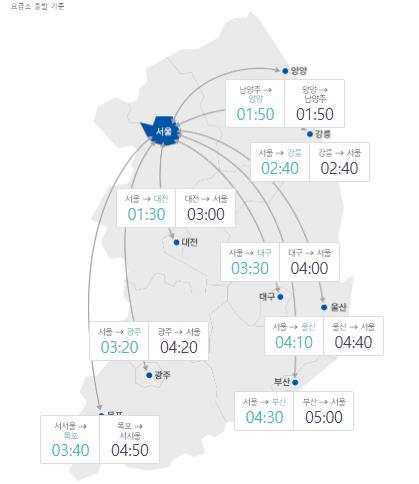 ▲ 서울∼전국 주요 도시 예상 소요 시간(21일 오후 10시 기준) [한국도로공사 홈페이지 캡처. 재판매 및 DB 금지]