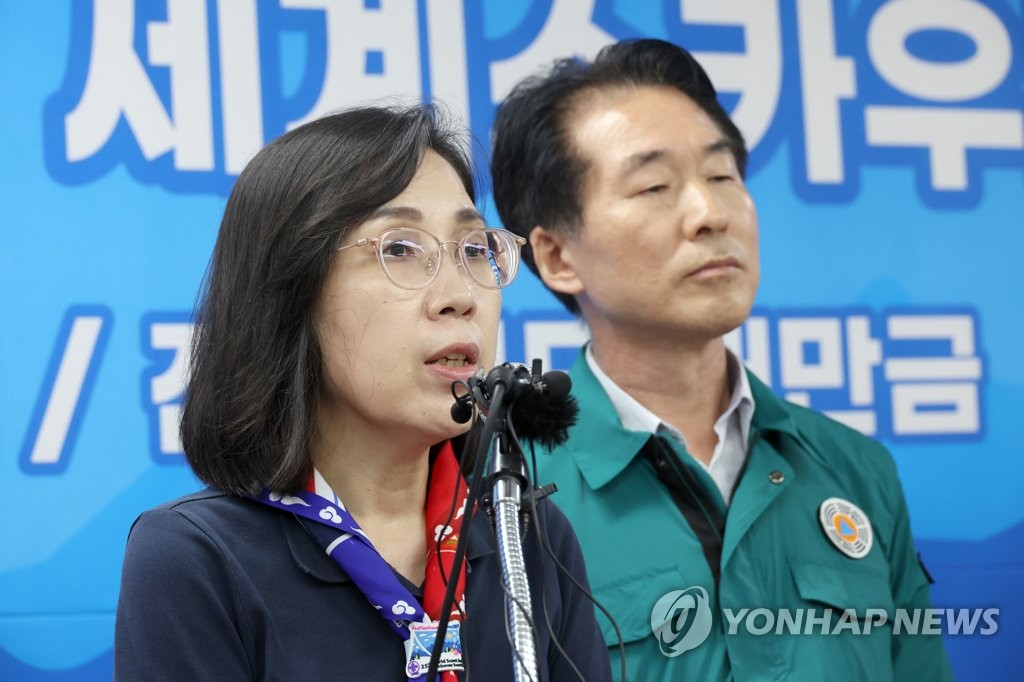 | ▲ 여가부 장관 "잼버리 내일 오전부터 영지서 비상 대피" (부안=연합뉴스) 김현숙 여성가족부 장관과 김성호 행정안전부 재난안전본부장이 7일 전북 부안군 잼버리장 브리핑룸에서 잼버리 야영지 철수 계획 획을 발표하고 있다. 2023.8.7 kan@yna.co.kr |