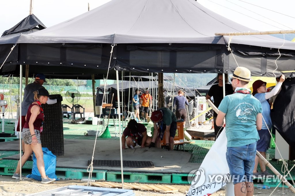 | ▲ 독일 잼버리 부스 정리 (부안=연합뉴스) 나보배 기자 = 독일 스카우트 대원들이 7일 전북 부안군 잼버리장 델타구역 내 부스를 정리하고 있다. 2023.8.7 warm@yna.co.kr |