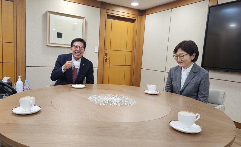 | ▲ 백진경 공공디자인페스티벌 조직위원장(오른쪽)과 환담하는 박형준 부산시장 [촬영 민영규] |