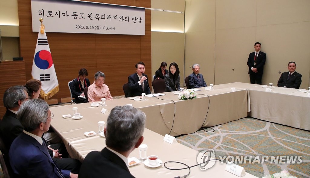 HIROSHIMA, Japan, May 19 (Yonhap) -- South Korean President Yoon Suk Yeol met with a group of Korean victims of the 1945 atomic bombing of Hiroshima on Friday, saying he is sorry their homeland could not be with them when they suffer sorrow and pain.
