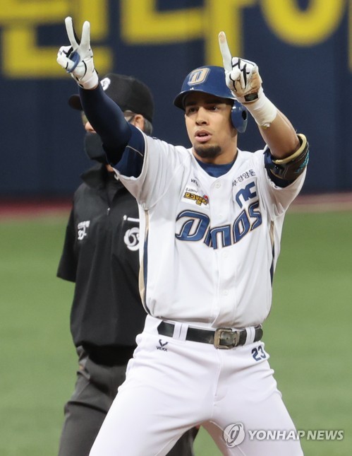 | ▲ '쳤어요' (서울=연합뉴스) 서명곤 기자 = 23일 오후 서울 구로구 고척스카이돔에서 2020 프로야구 포스트시즌 한국시리즈(KS) 5차전 두산 베어스와 NC 다이노스의 경기 5회말 1사 2루. NC 알테어가 1타점 1루타를 친 뒤 기뻐하고 있다. 2020.11.23 seephoto@yna.co.kr |