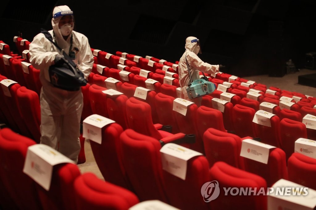 | ▲ Quarantine officials disinfect a theater of the Busan Cinema Center in Busan during the Busan International Film Festival on Oct. 9, 2021. (Yonhap) |