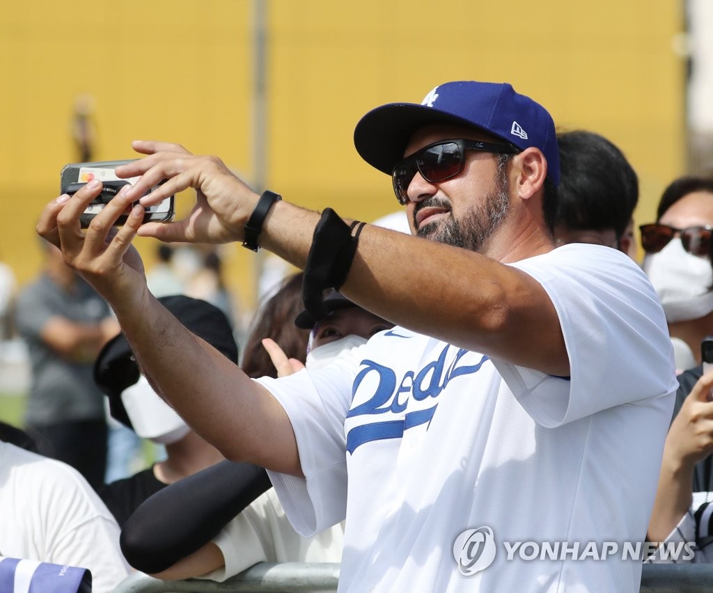 ▲ 팬들과 사진 찍는 곤살레스 (영종도=연합뉴스) 김상연 기자 = 미국프로야구 메이저리그(MLB) 사무국이 주최하는 'FTX MLB 홈런더비 X 서울' 경기가 열린 17일 오후 인천 영종도 파라다이스시티 내 특설 경기장에서 MLB 출신 곤살레스가 팬들과 기념사진을 찍고 있다. 2022.9.17 goodluck@yna.co.kr