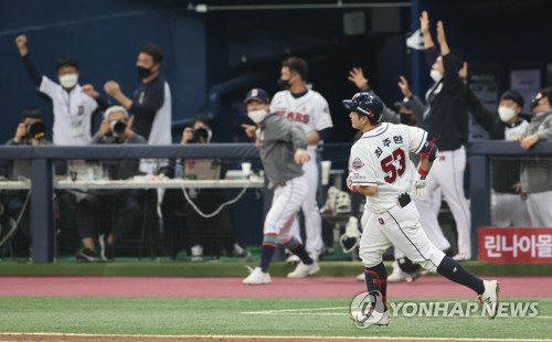 | ▲ 최주환 '2점 홈런!' (서울=연합뉴스) 임화영 기자 = 13일 오후 서울 구로구 고척스카이돔에서 열린 2020 KBO 프로야구 포스트시즌 플레이오프 4차전 kt wiz와 두산 베어스의 경기. 4회말 2사 2루 두산 최주환이 2점 홈런을 친 뒤 그라운드를 달리고 있다. 2020.11.13 hwayoung7@yna.co.kr |