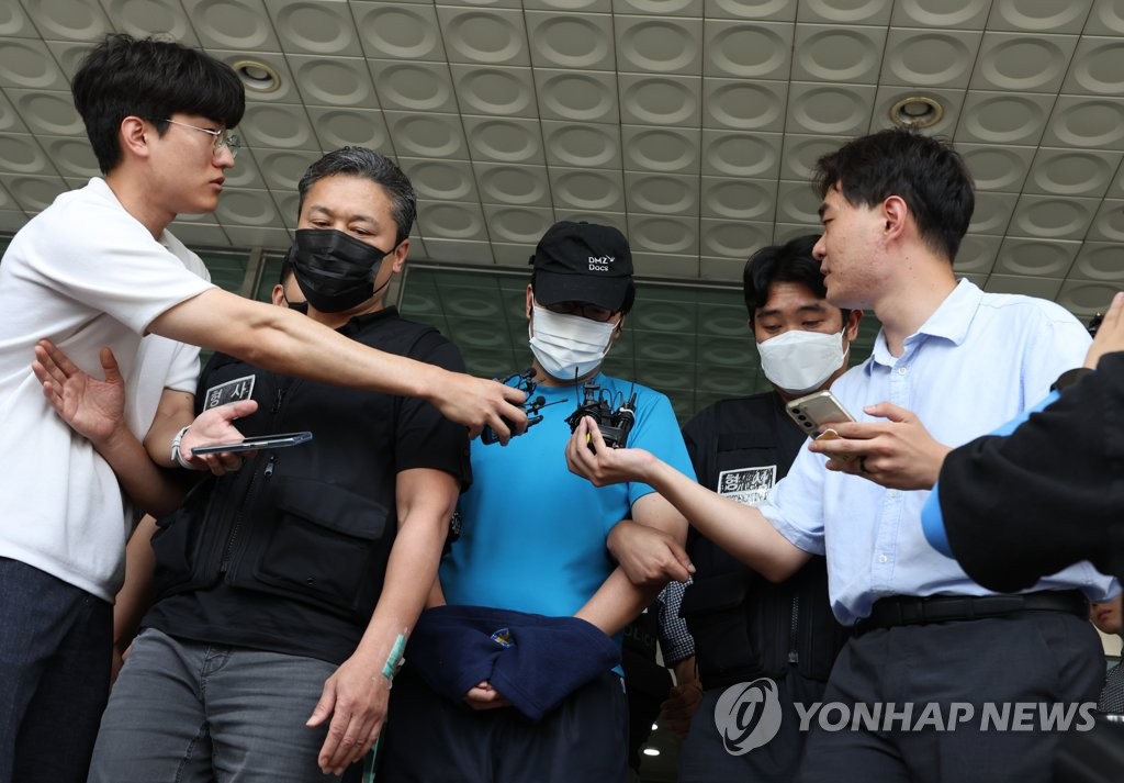 | ▲ Reporters pose questions to a suspect (C) accused of assaulting and raping a woman on a hiking trail in Seoul on Aug. 17, 2023, as he leaves the Gwanak police station in southern Seoul to attend an arrest warrant review process at the Seoul Central District Court on Aug. 19. (Yonhap) |