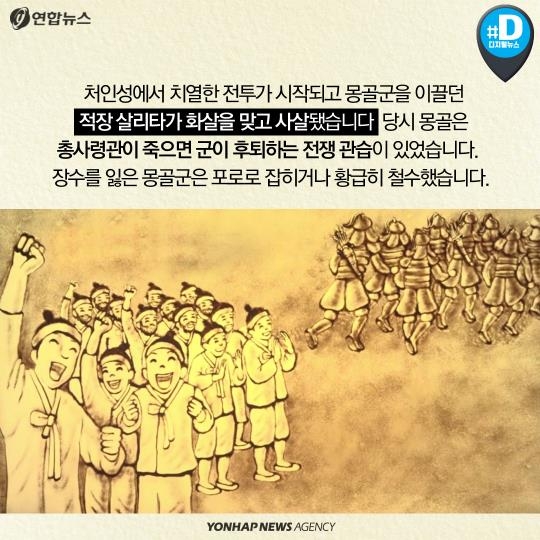 처인성에서 치열한 전투가 시작되고 몽골군을 이끌던 적장 살리타가 화살을 맞고 사살됐습니다. 당시 몽골은 총사령관이 죽으면 군이 후퇴하는 전쟁 관습이 있었습니다.