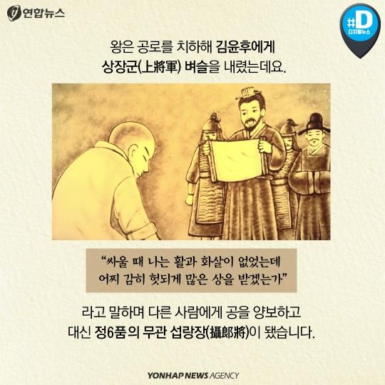 "싸울 때 나는 활과 화살이 없었는데 어찌 감히 헛되게 많은 상을 받겠는가"라고 말하며 다른 사람에게 공을 양보하고 대신 정6품의 무관 섭랑장(攝郞將)이 됐습니다.