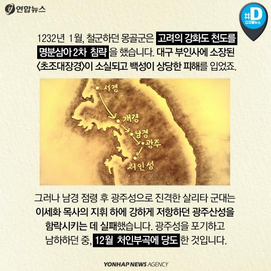 1232년 1월, 철군하던 몽골군은 고려의 강화도 천도를 명분 삼아 2차 침략을 했습니다. 대구 부인사에 소장된 <초조대장경>이 소실되고 백성이 상당한 피해를 보았죠.