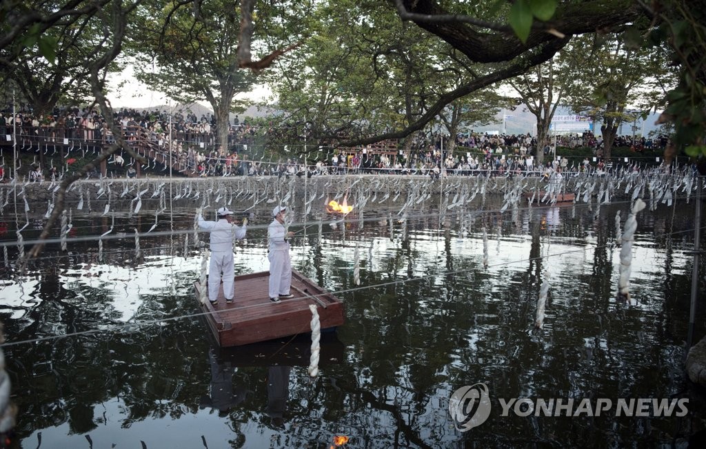 15일 오후 경남 함안군 함안면 괴산리 무진정(無盡亭) 정자 주변에서 '함안 낙화놀이'가 시작되자 수천 명의 관광객이 일제히 환호성을 질렀다.