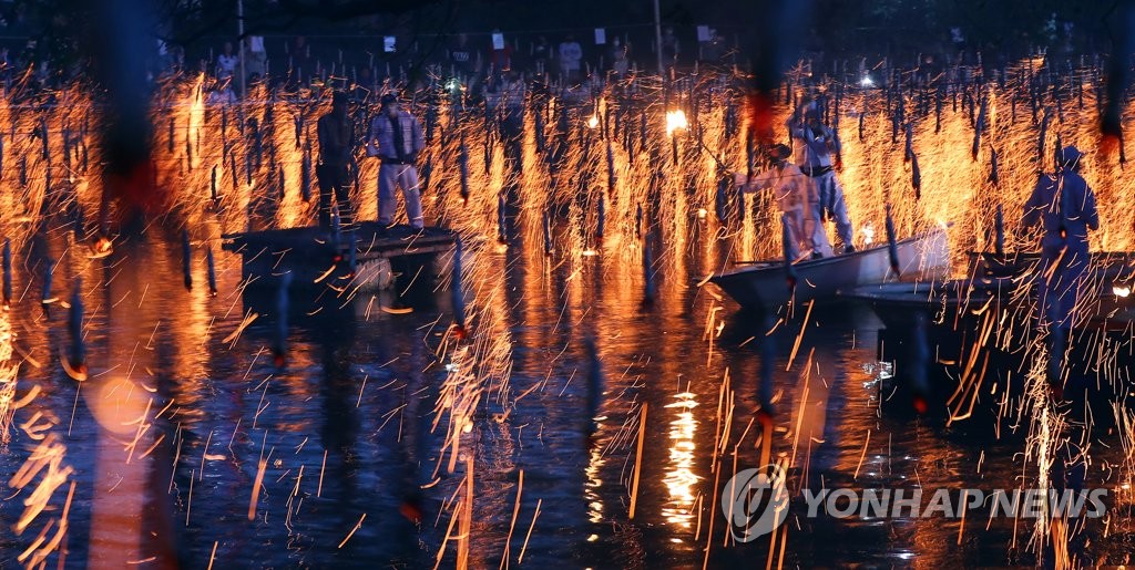 | ▲ '경남 함안 낙화놀이'…선조가 만든 불꽃 (함안=연합뉴스) 김동민 기자 = 15일 오후 경남 함안군 함안면 괴산리 무진정에서 '함안 낙화놀이'가 열리고 있다. 함안 낙화놀이는 숯과 한지를 꼬아 만든 실 수천 개를 줄에 매달아 놓고 저녁 무렵 불을 붙이는 민속놀이로 경남 무형문화재 제33호다. 2022.10.15 image@yna.co.kr |
