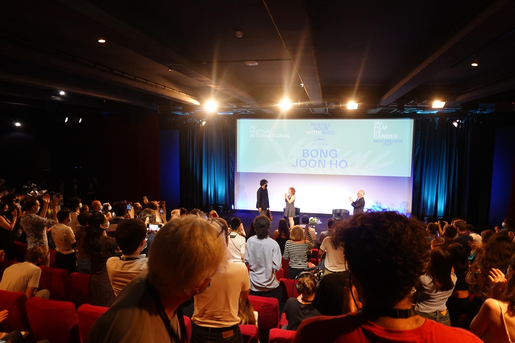| ▲ 봉준호 감독에게 기립박수 보내는 관객들 (칸=연합뉴스) 현혜란 특파원 = 제74회 칸 국제 영화제가 7일(현지시간) 마련한 봉준호 감독과의 대화 행사에 봉 감독이 등장하자 관객들이 일어나서 손뼉을 치며 환호하고 있다. 2021.7.7 runran@yna.co.kr |