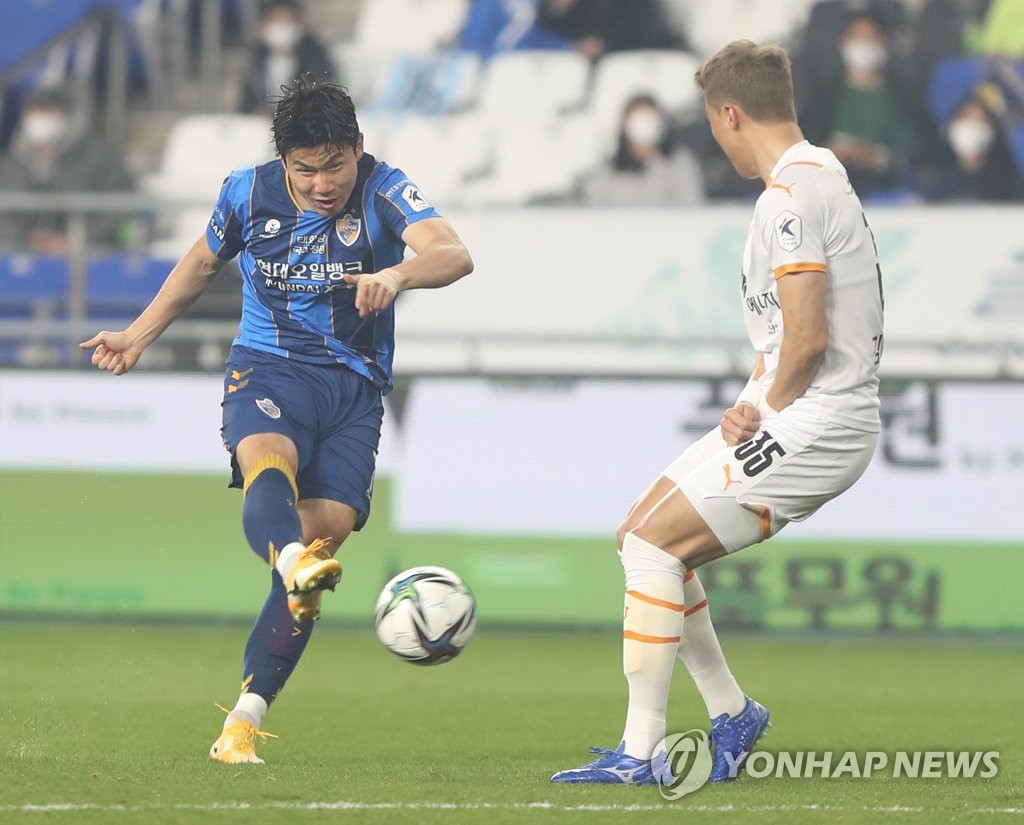 | ▲ Kim In-sung of Ulsan Hyundai FC (L) takes a shot against Jeju United in the clubs' K League 1 match at Ulsan Munsu Football Stadium in Ulsan, 415 kilometers southeast of Seoul, on March 16, 2021. (Yonhap) |