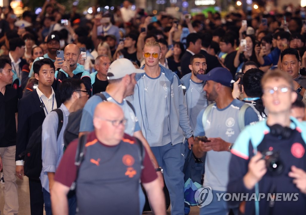| ▲ 한국 도착한 엘링 홀란 (영종도=연합뉴스) 김성민 기자 = 아틀레티코 마드리드와 쿠팡플레이 친선전을 앞둔 영국 프리미어 리그 맨체스터 시티 엘링 홀란이 27일 오후 인천국제공항 제1여객터미널에서 입국장을 나서고 있다. 2023.7.27 ksm7976@yna.co.kr |