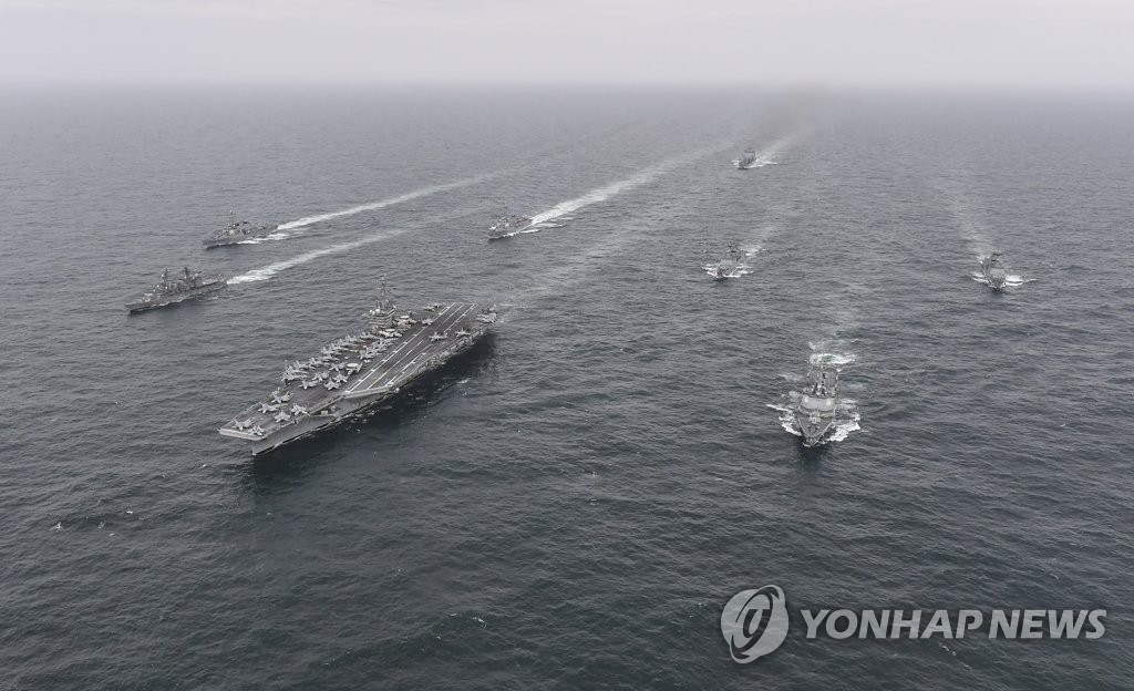 | ▲ The Yulgok YiYi destroyer of South Korea, the U.S. Navy nuclear-powered aircraft carrier USS Nimitz and the JS Umigiri destroyer of Japan sail in the international waters south of the southern island of Jeju on April 4, 2023, in this file photo released by the South Korean Navy. (PHOTO NOT FOR SALE) (Yonhap) |