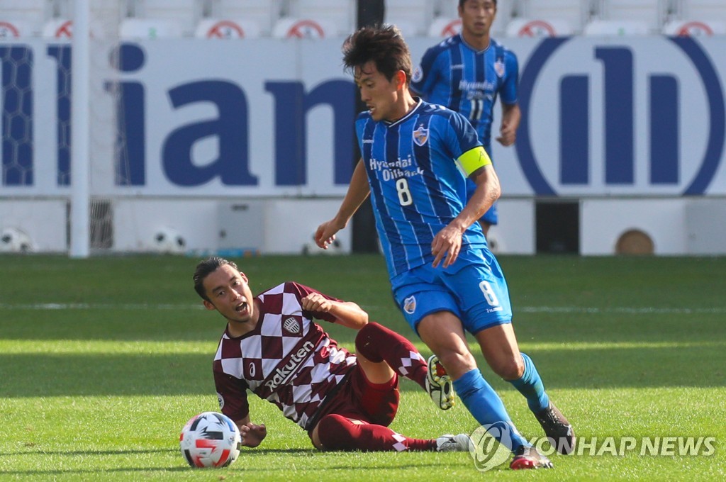| ▲ In this AFP photo, Sin Jin-ho of Ulsan Hyundai FC (R) dribbles past Takuya Yasui of Vissel Kobe during the teams' semifinals match at the Asian Football Confederation (AFC) Champions League at Jassim bin Hamad Stadium in Doha on Dec. 13, 2020. (Yonhap) |