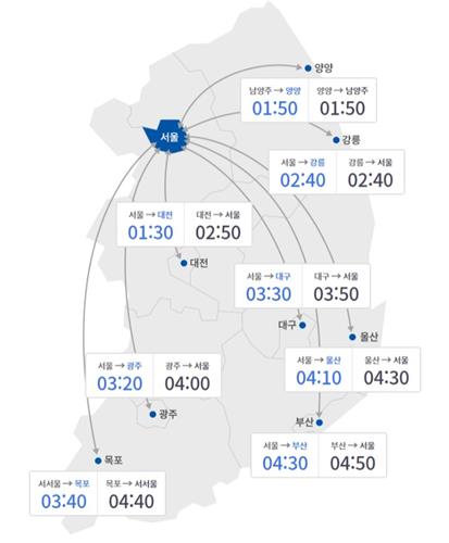 반대로 서울요금소를 출발해 각 지역까지 걸리는 예상 시간은 부산 4시간 30분, 울산 4시간 10분, 대구 3시간 30분, 광주 3시간 20분, 강릉 2시간 40분, 대전 1시간 30분이다.