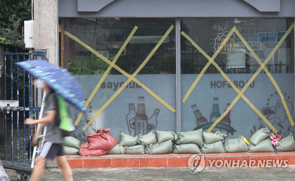 | ▲ Super Typhoon Hinnamnor approaches Windows are taped and sand bags are stacked at a restaurant in Ulsan in preparation for the approach of the super strong Typhoon Hinnamnor. (Yonhap) |