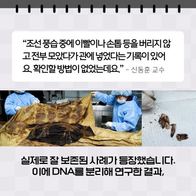 "조선 풍습 중에 이빨이나 손톱 등을 버리지 않고 전부 모았다가 관에 넣었다는 기록이 있어요. 확인할 방법이 없었는데요."- 신동훈 교수