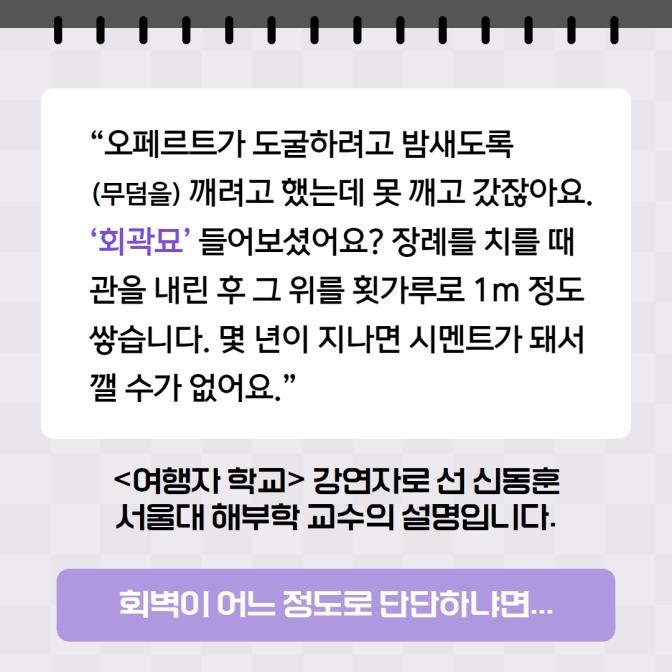 "오페르트가 도굴하려고 밤새도록 (무덤을) 깨려고 했는데 못 깨고 갔잖아요. '회곽묘' 들어보셨어요? 장례를 치를 때 관을 내린 후 그 위를 횟가루로 1m 정도 쌓습니다. 몇 년이 지나면 시멘트가 돼서 깰 수가 없어요."