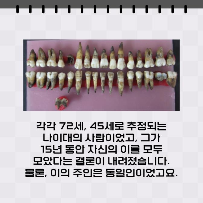 실제로 잘 보존된 사례가 등장했습니다. 이의 DNA를 분리해 연구한 결과, 각각 72세, 45세로 추정되는 나이대의 이였고, 15년 동안 자신의 이를 모두 모았다는 결론이 내려졌습니다.