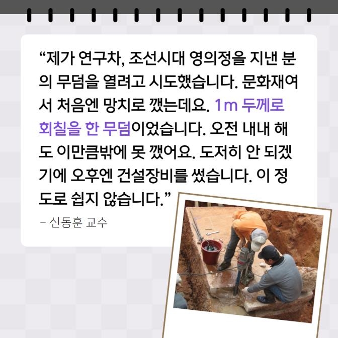 "제가 조선시대 영의정을 지낸 분의 무덤을 연구차 열려고 시도했습니다. 문화재여서 망치로 처음에 깼는데요. 회칠을 1m 한 무덤이었습니다. 오전 내내 해도 이만큼밖에 못 깼어요. 도저히 안 되겠기에 오후엔 건설장비를 썼습니다. 이 정도로 쉽지 않습니다."