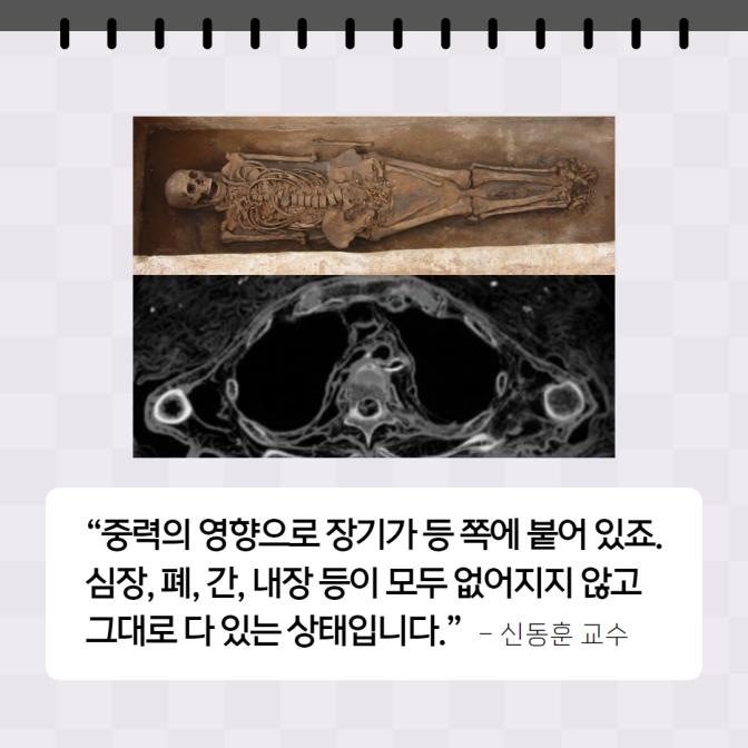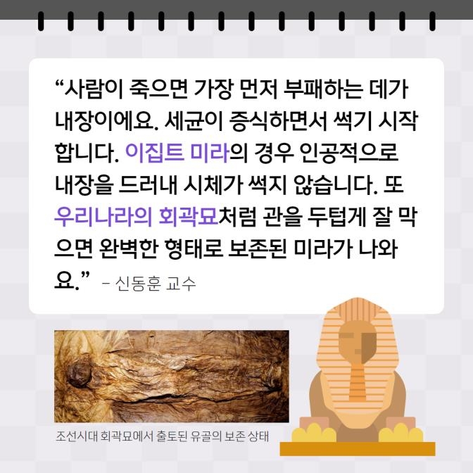 "사람이 죽으면 가장 먼저 부패하는 데가 내장이에요. 세균이 증식하면서 썩기 시작합니다. 이집트 미라의 경우 인공적으로 내장을 드러내 시체가 썩지 않습니다. 또 우리나라의 회곽묘처럼 관을 두텁게 잘 막으면 완벽한 형태로 보존된 미라가 나와요." - 신동훈 교수