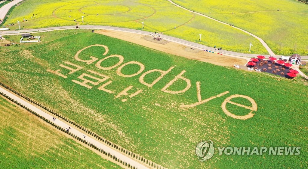 | ▲ This photo, taken April 17, 2022, shows the phrase "Goodbye, coronavirus" in a rye field in Anseong, south of Seoul, as the country is set to lift almost all social distancing rules this week. (Yonhap) |