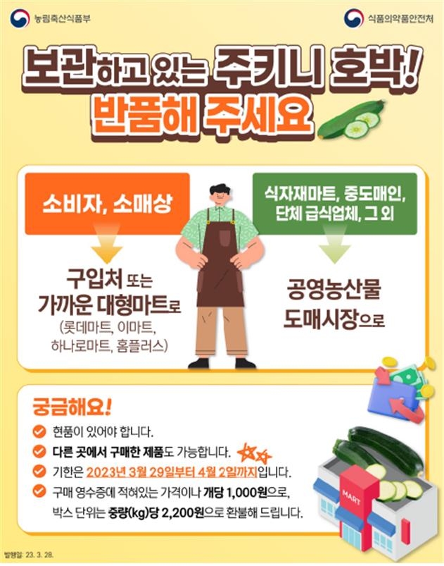 식품의약품안전처와 농림축산식품부에 따르면 국내산 주키니 호박을 사서 보관 중인 소비자나 소매상은 오는 29일부터 내달 2일까지 구매처나 가까운 대형마트(롯데마트, 이마트, 하나로마트, 홈플러스)에 호박을 반품하면 된다.
