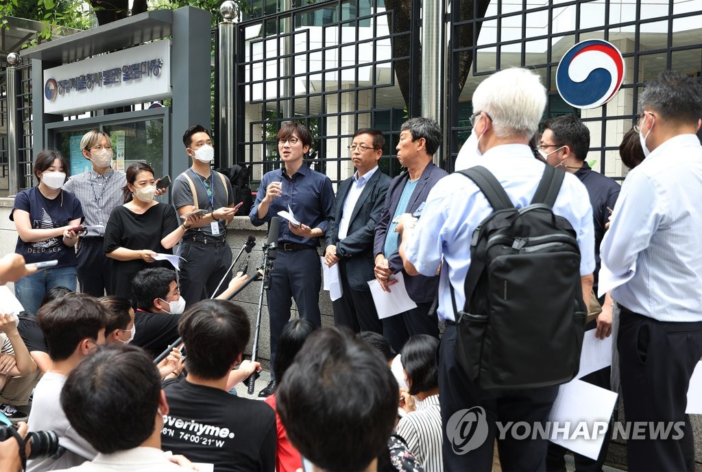 | ▲ Legal representatives of Korean forced labor victims hold a press briefing in front of the foreign ministry building in Seoul on Aug. 9, 2022. (Yonhap) |