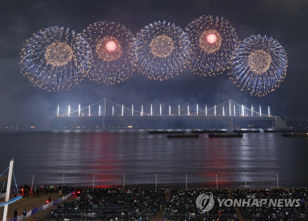 | ▲ Fireworks are set off above Gwangalli Beach in South Korea's southeastern port city of Busan on April 6, 2023, to promote the city's bid to host the 2030 World Expo. (Yonhap) |