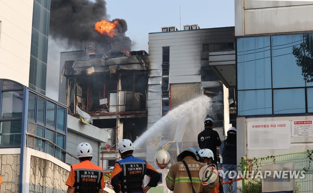 HWASEONG, South Korea, Sept. 30 (Yonhap) -- An explosion sparked a fire at a pharmaceutical factory in Hwaseong, south of Seoul, on Friday, leaving one person dead and 17 others injured, officials said.