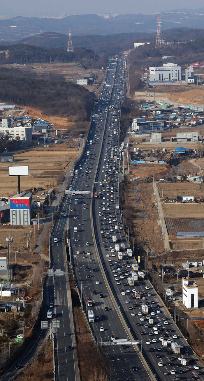 In this aerial photo taken from a Gyeonggi Bukbu Provincial Police Agency helicopter on Jan. 24, 2025, heavy traffic congestion occurs on southbound lanes of a highway linking Seoul to the southeastern port city of Busan in Anseong, south of Seoul, as the annual rush of travelers heading to their hometowns began one day ahead of Seol, the six-day Lunar New Year's holiday that runs Jan. 25-30. (Yonhap)