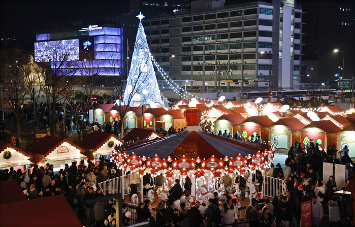 Visitors gather at Gwanghwamun Square, where a Christmas market has been set up, in central Seoul on Dec. 14, 2025. (Yonhap)