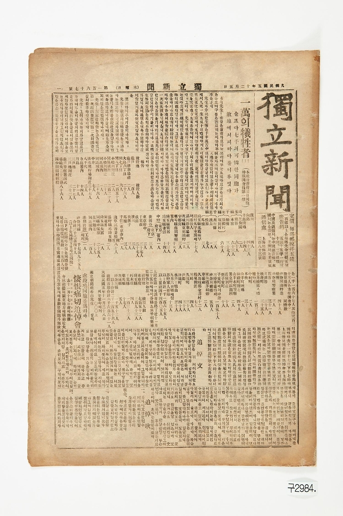 | ▲ 1923년 12월 5일자 독립신문 당시 조선인 학살로 인한 사망자를 6천661명으로 보도했다. [책읽는고양이 제공. 재판매 및 DB 금지] |