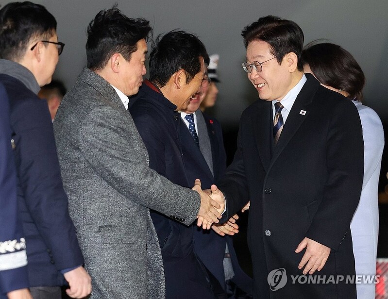 | ▲ President Lee Jae Myung (R) shakes hands with Kang Hoon-sik (2nd from L), the presidential chief of staff, upon arrival at Seoul Air Base in Seongnam, south of Seoul, on Jan. 7, 2026, from his trip to China. (Yonhap) |