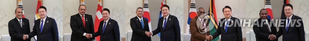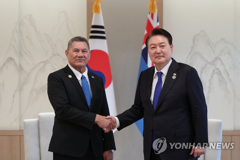 Yoon held talks with Kiribati's President Taneti Maamau at his office at 3 p.m., followed by Tongan Prime Minister Siaosi Sovaleni and Prime Minister Kausea Natano of Tuvalu.