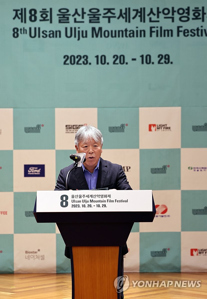 ▲ 인사말 하는 이순걸 울주군수 (울산=연합뉴스) 장지현 기자 = 25일 오전 울산시청 시민홀에서 열린 제8회 울산울주세계산악영화제 기자회견에서 영화제 이사장인 이순걸 울주군수가 인사말하고 있다. 2023.9.25 jjang23@yna.co.kr