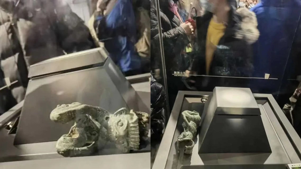 | ▲ 관람객들 몸싸움으로 진열대에서 떨어진 청동유물 [봉면신문 캡처. 재판매 및 DB 금지] |