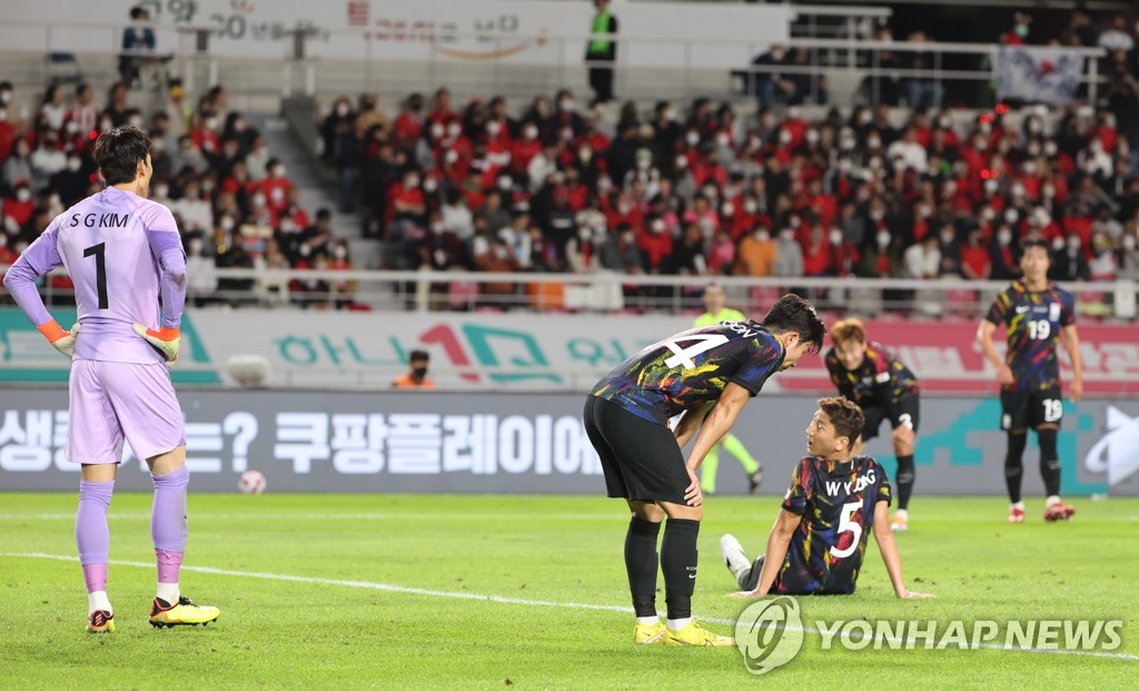 | ▲ 아쉬운 실점 (고양=연합뉴스) 김주성 기자 = 23일 고양종합운동장에서 열린 한국과 코스타리카 축구 대표팀 평가전에서 동점골 허용 후 한국 선수들이 아쉬워하고 있다. 2022.9.23 utzza@yna.co.kr |